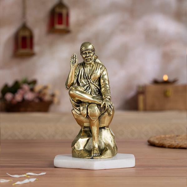 Inspired by the revered saint of Shirdi, Puskara presents a finely crafted brass Sai Baba murti, depicting him seated on a rock with one hand raised in blessing a symbol of his eternal compassion and wisdom.