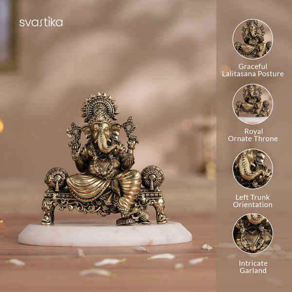 Discover our regal 4" Lord Ganesha brass idol, a perfect Ganesh idol for pooja room or office desk. This exquisite Ganesh Statue depicts the deity seated on a throne in Lalitasana posture, with his loyal mouse at his feet.