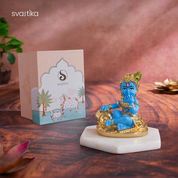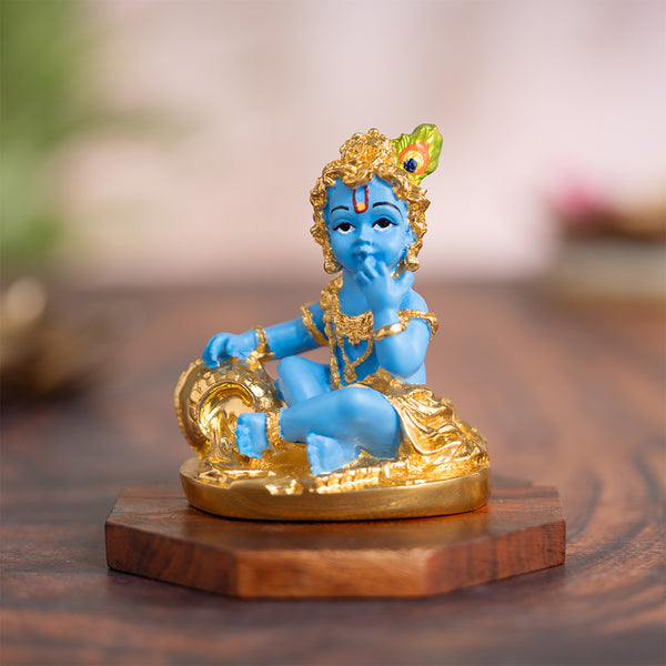 Capture the mischievous essence of this enchanting 3.3-inch Laddu Gopal murti. Masterfully crafted from premium polyresin and adorned with an opulent 24-karat gold-plated finish, it depicts a playful child indulging in the sweet delight of makhan (butter). More than just a decorative piece, this figurine radiates a sense of childlike wonder and joy that is sure to bring a smile to any space.