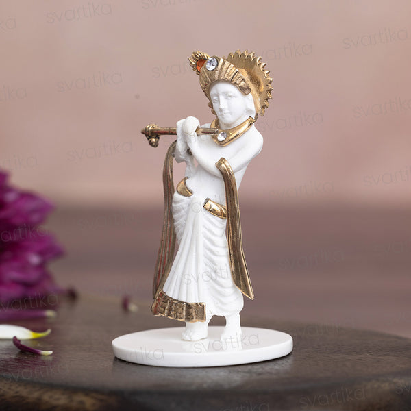 This exquisite 2.5" Small Standing Krishna Idol is a must-have for devotees seeking to infuse their car or living space with divine energy. Masterfully crafted from marble dust and adorned with a gold-plated finish, it captures Lord Krishna's enchanting form as he plays the mesmerizing flute.