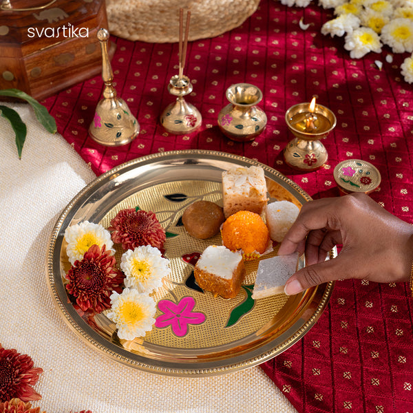 - 10 Inch Floral Thali: The elegant centerpiece with intricate floral patterns and ample space for sacred offerings.