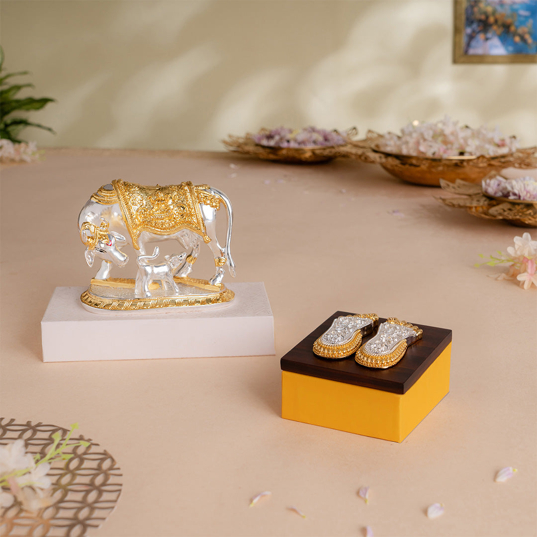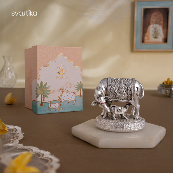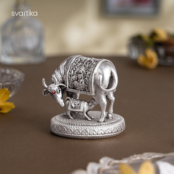 Enhance the spiritual ambiance of your home with this divinely crafted kamdhenu cow with calf idol, symbolizing abundance, purity, and motherly grace. Considered the wish-fulfilling cow in Hindu mythology, this kamadhenu idol in silver is a powerful spiritual element to invoke blessings of prosperity and harmony.