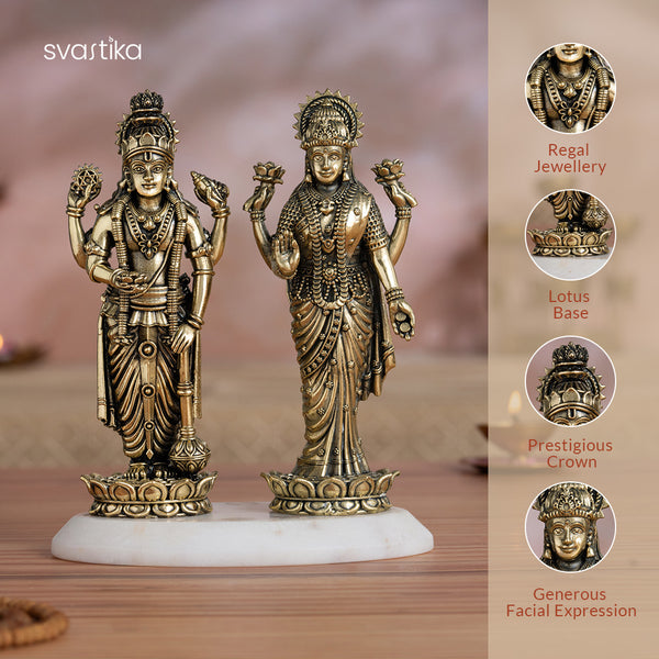 Invoke the divine blessings of Lord Vishnu and Mahalakshmi with this magnificent Brass Vishnu Lakshmi Idol Pair.