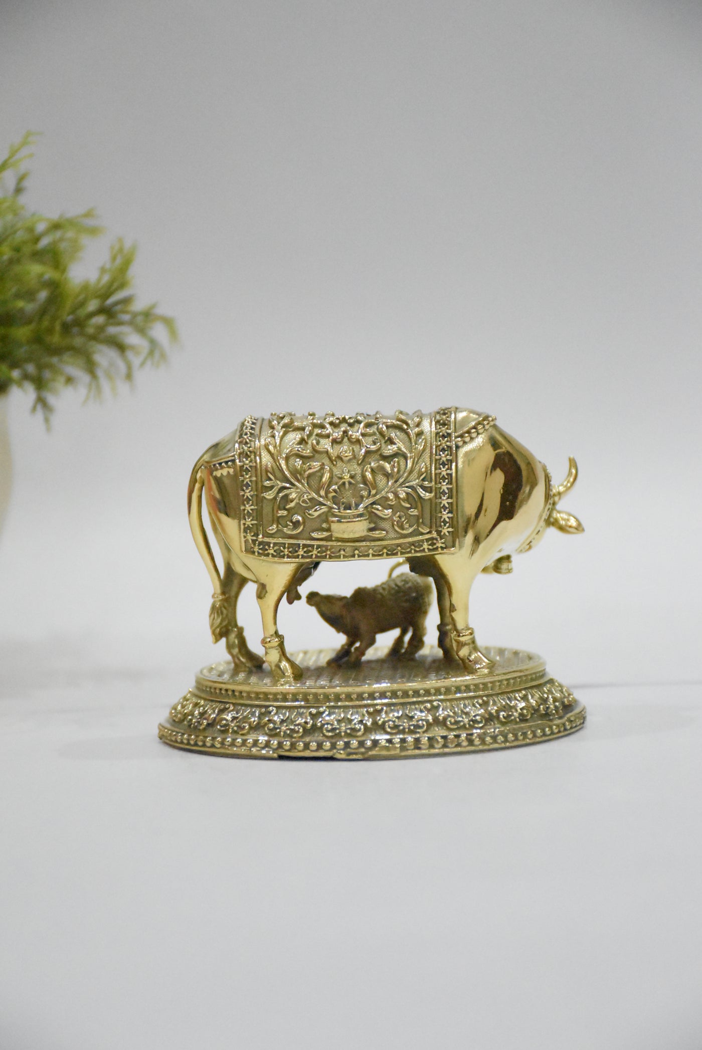 • Premium solid brass idol featuring Kamdhenu with calf for prosperity & nurturing