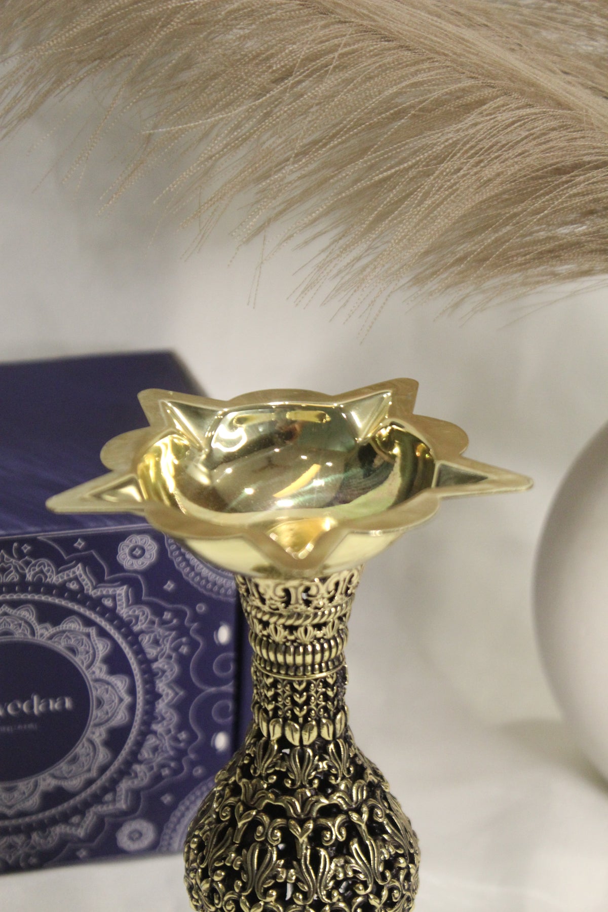 Bring divine radiance to your home with this exquisitely handcrafted Brass Deepak, a perfect blend of tradition and artistry. Designed with intricate floral carvings and an elegant antique finish, this oil lamp embodies timeless Indian craftsmanship.