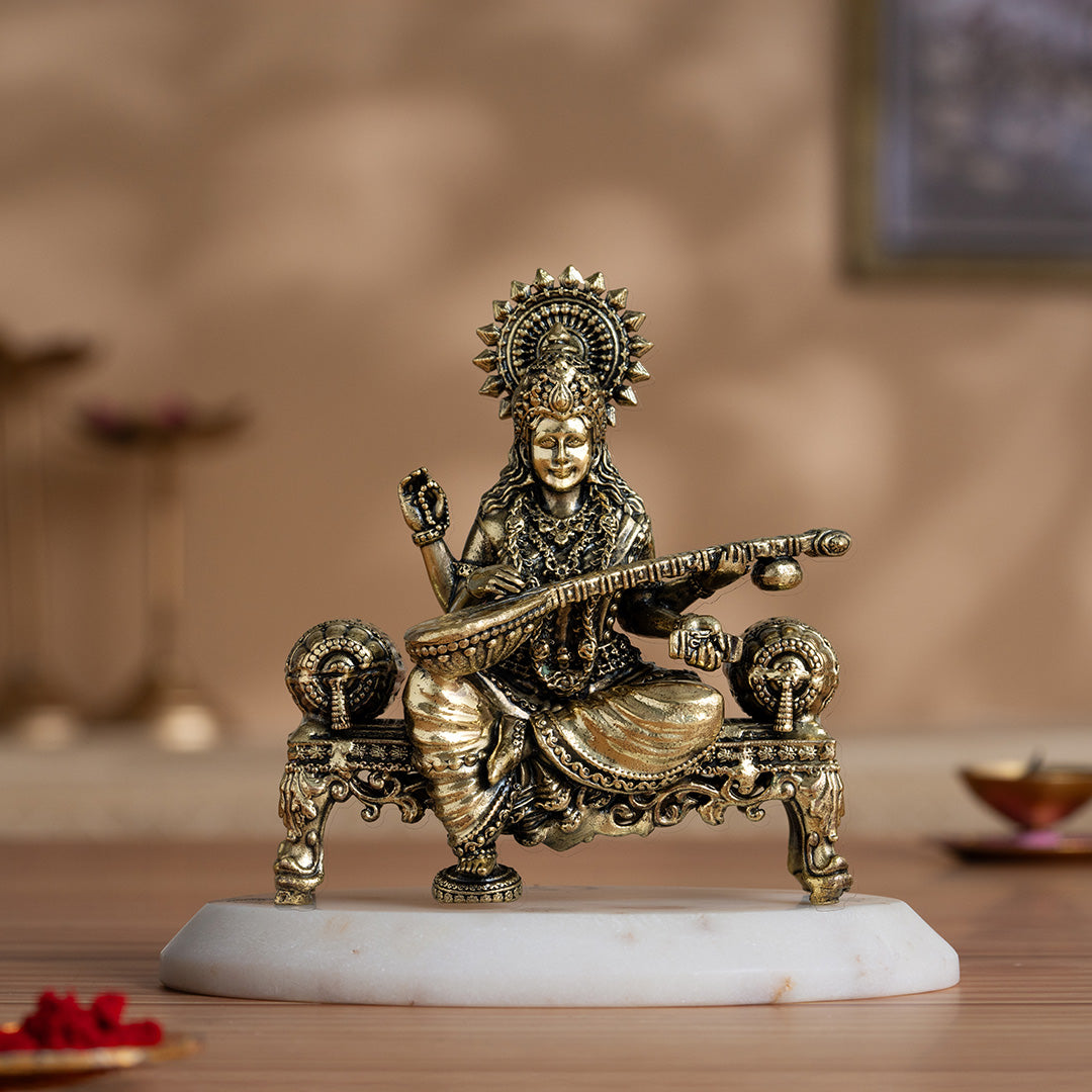 Brass Saraswati Idol Playing Veena On Singhasan (4 Inch)