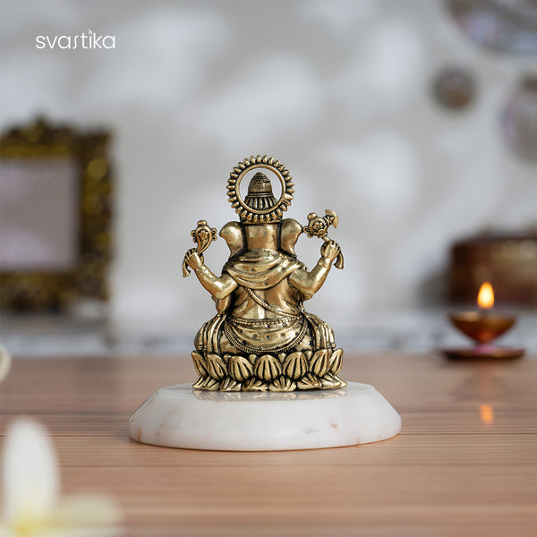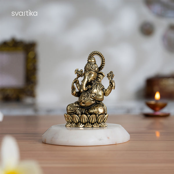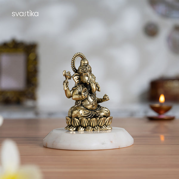 Discover our elegant 3" Left-Trunk Brass Ganesha Statue, a perfect Ganesh idol for a pooja room or office desk. This Lord Ganesha murti, seated gracefully on a lotus, symbolizes enlightenment and purity.
