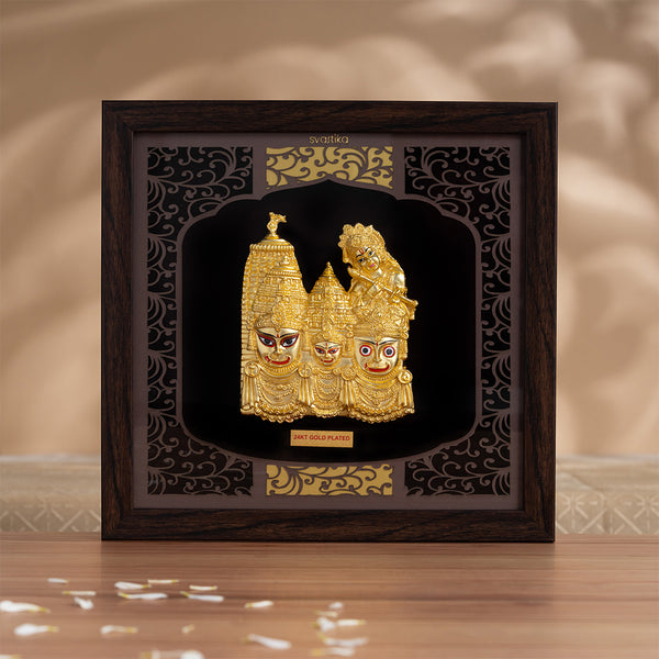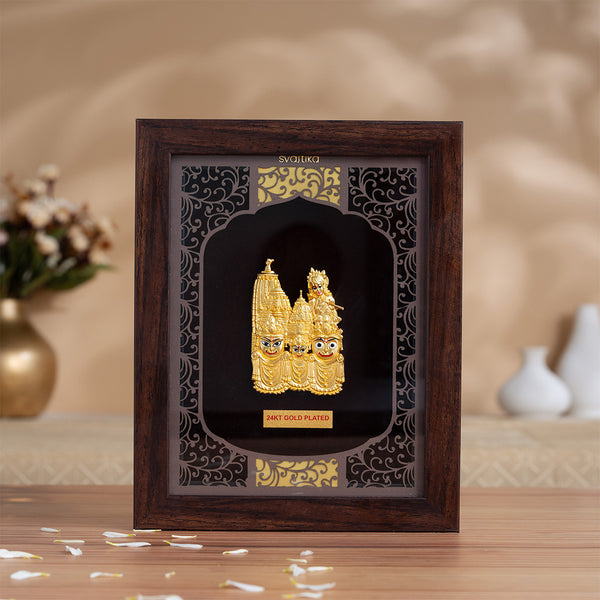 Featuring the Puri Temple behind Subhadra and Balabhadra, this frame tells a captivating spiritual story. Crafted with intricate 24K gold-plated details on a high-quality MDF frame with a wooden finish and protected by a durable acrylic sheet, this piece combines elegance with durability.