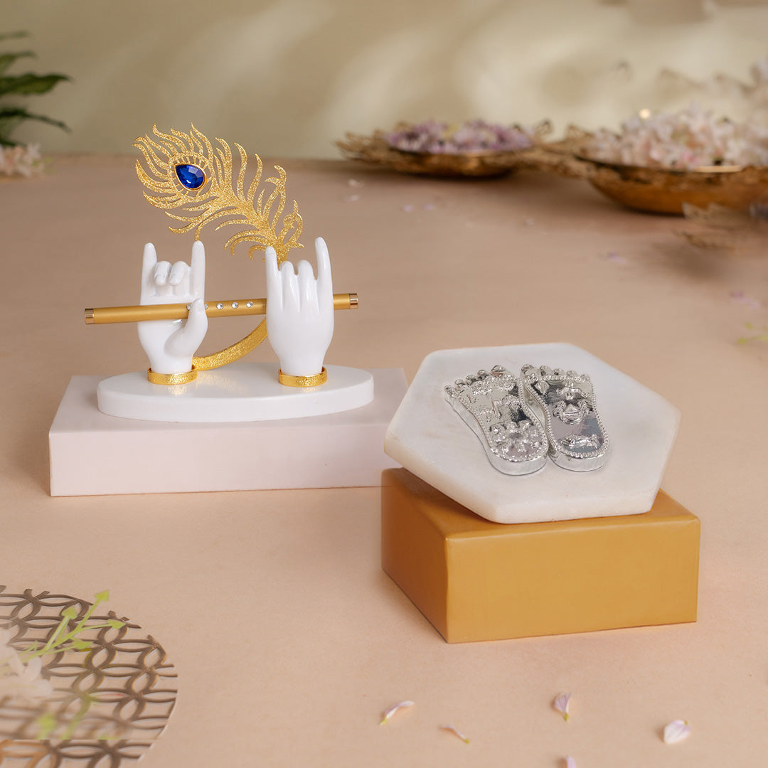 Discover the profound essence of devotion and transcendence with our silver plated lotus feet of Shree Krishna, a symbolic representation deeply rooted in Hindu mythology. Revered for their exceptional attributes, Krishna's lotus feet possess the power to cleanse and uplift, serving as a haven for those who seek solace within.
