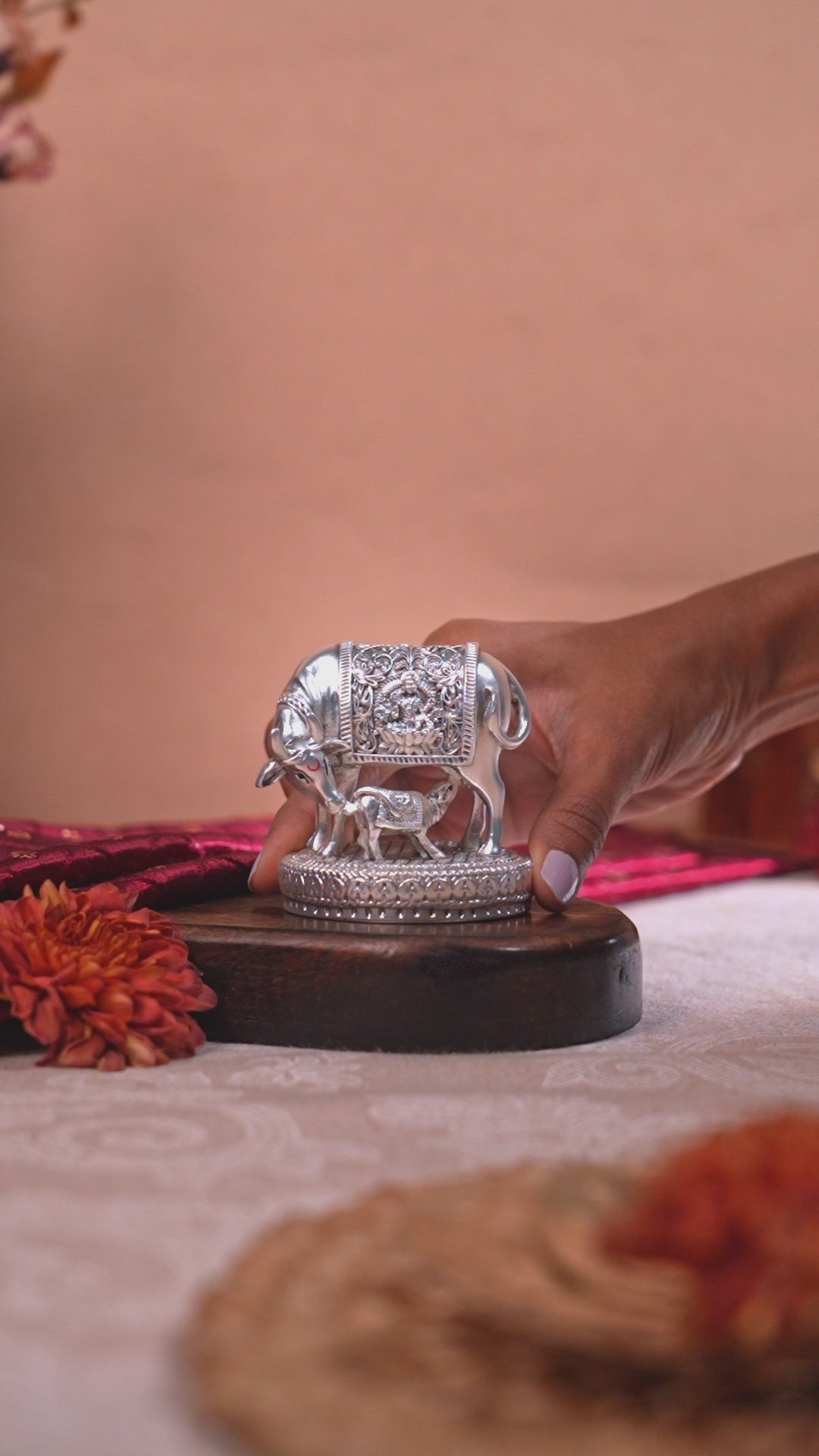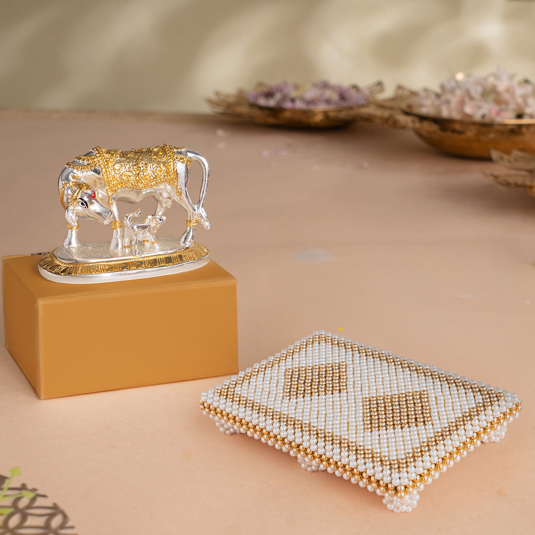 Enhance the spiritual ambiance of your home with this divinely crafted kamdhenu cow with calf idol, symbolizing abundance, purity, and motherly grace. Considered the wish-fulfilling cow in Hindu mythology, this kamadhenu idol in silver is a powerful spiritual element to invoke blessings of prosperity and harmony.
