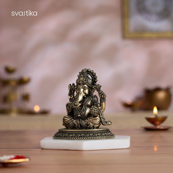 The small Ganesha murti, with its four symbolic arms and loyal Mushakraj, is perfect for Ganpati idols for Ganesh Chaturthi or year-round display. Its compact size makes it versatile for various settings.
