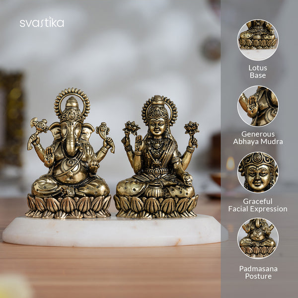 Perfect for weddings and special occasions, this brass Lakshmi Ganesh idol symbolizes prosperity and success. Add this beautifully crafted murti pair to your collection for a touch of elegance and cultural charm.