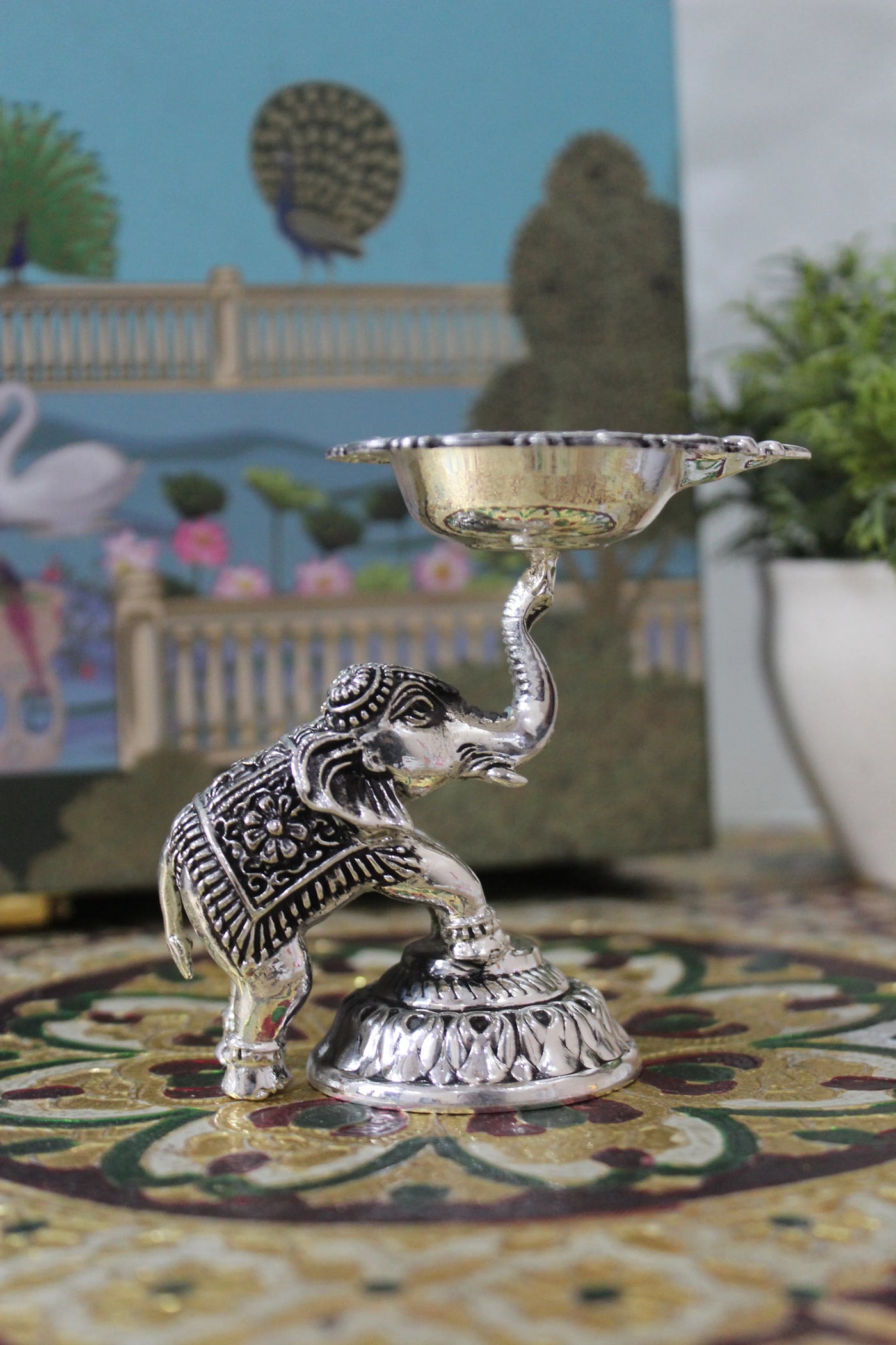 • A beautifully crafted brass diya in a striking silver finish, featuring a regal elephant standing on a lotus pedestal with its trunk raised to support a round oil cup.