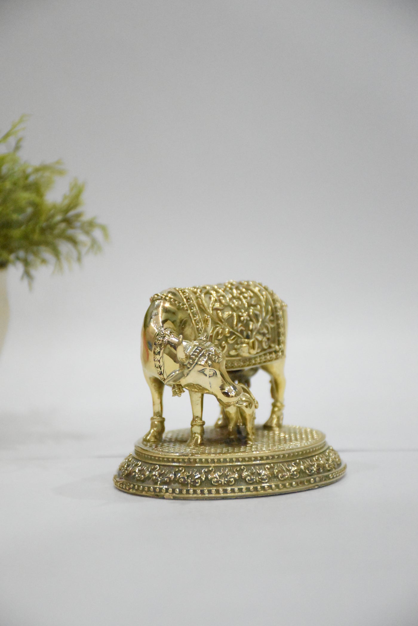 • Premium solid brass idol featuring Kamdhenu with calf for prosperity & nurturing