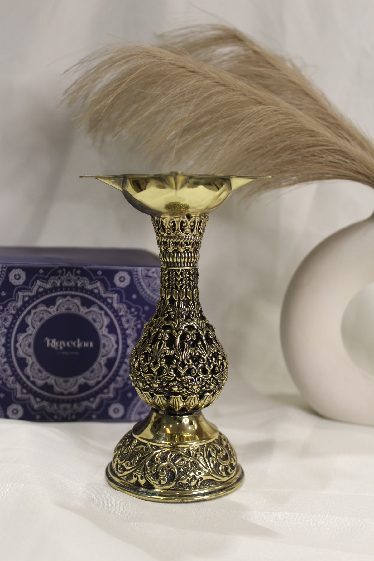 The wide diya bowl ensures a steady flame, making it ideal for daily puja rituals, festive celebrations, or serene home décor. Its graceful silhouette and polished golden shine create a warm, spiritual ambiance wherever placed.