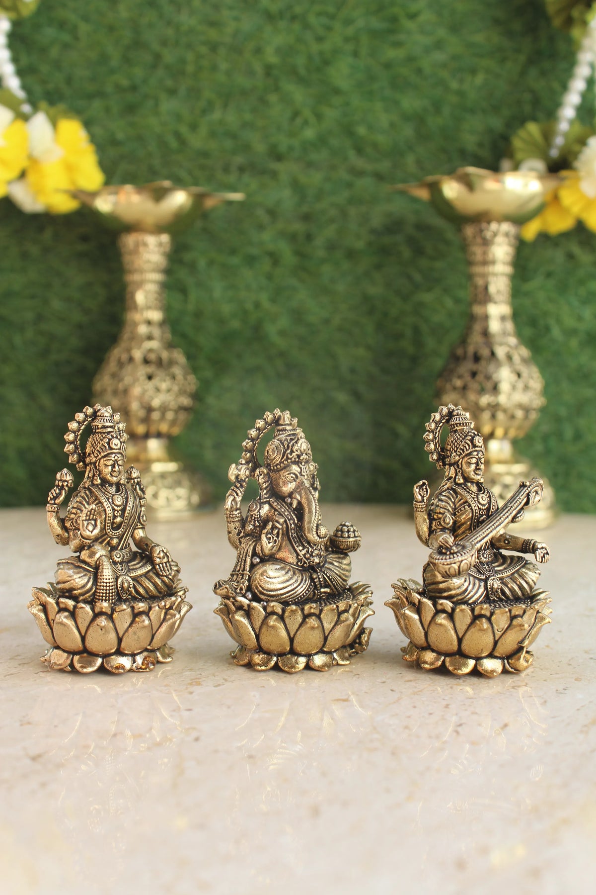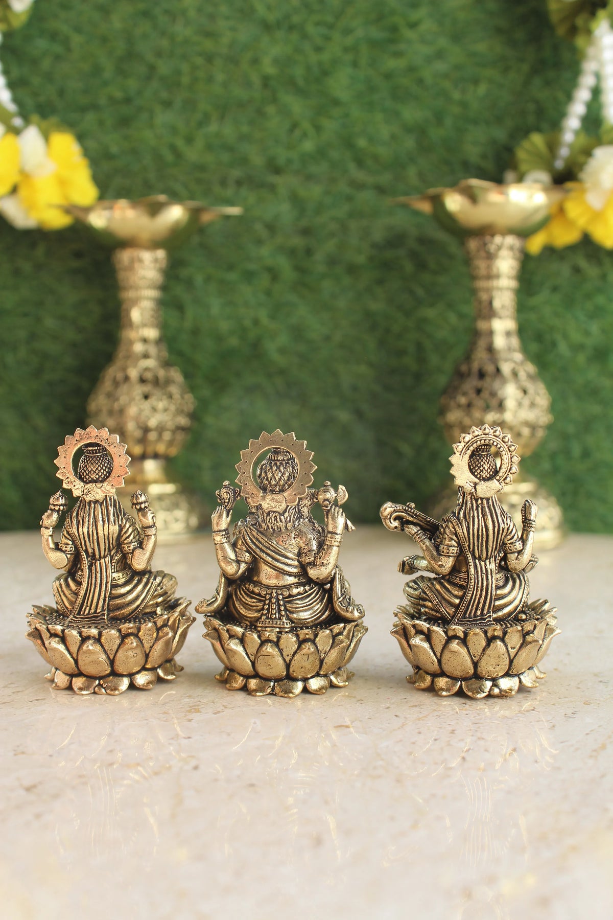 Laxmi Ganesh Saraswati Brass Idol Set 2.5" Divine Trio for Puja & Home Decor