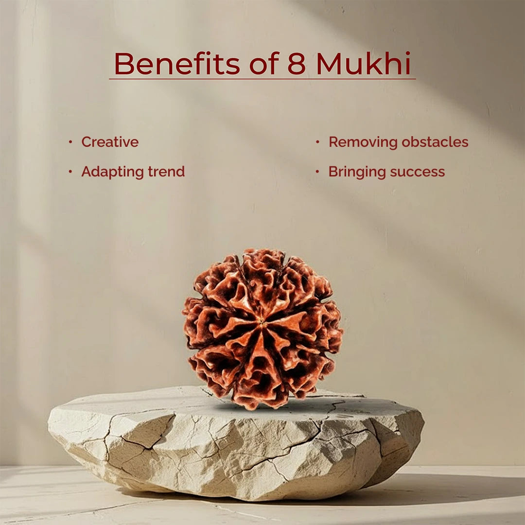 Ruling deity: The Eight Mukhi Rudraksha is ruled by Ganesha. It is also associated with the eight divine entities known as Ashta Vasus, symbolizing power and strength.